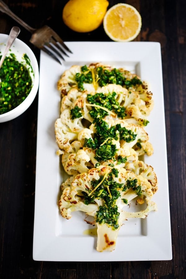 Alternatively, plate the cauliflower steak individually. Serve over a bowl of creamy polenta, creamy risotto, rice, quinoa, stewy white beans or chickpeas etc. and drizzle with the gremolata.