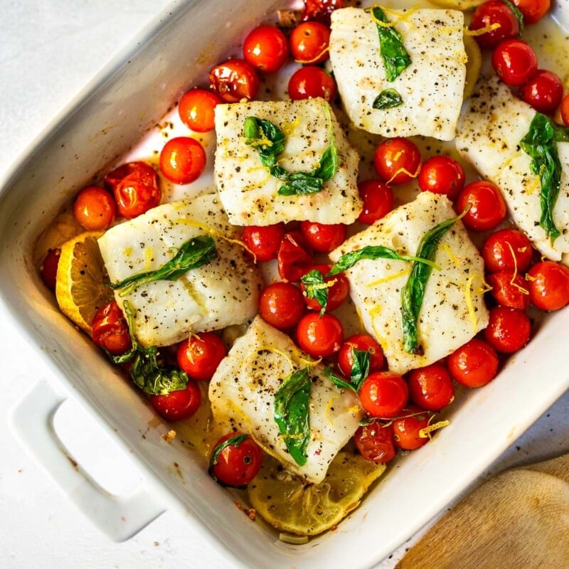 This delicious baked cod recipe features burst tomatoes, basil, garlic, and lemon. It can be made in 30 minutes flat-fast and easy!